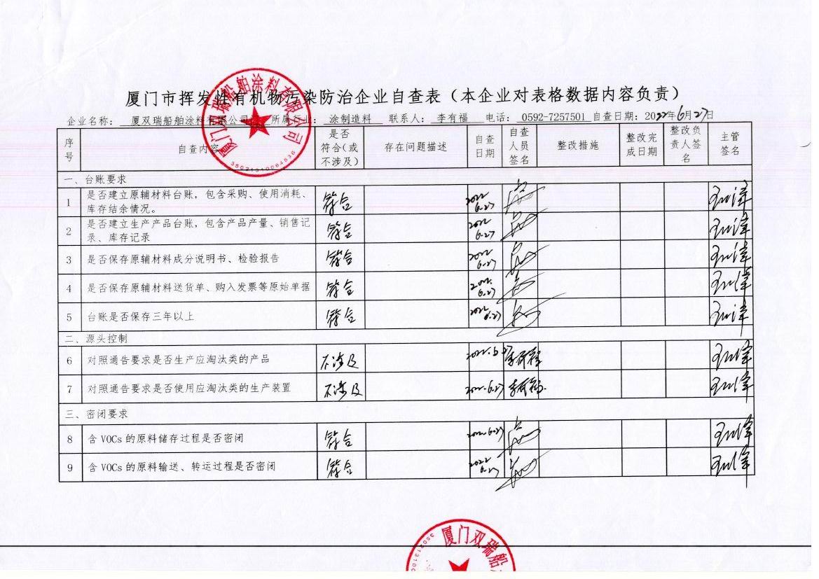 揮發(fā)性有機物污染防治企業(yè)自查表2022年2第季(廈門(mén)雙瑞船舶涂料有限公司)